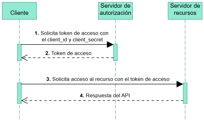 El INS utiliza un grant denominado client_credentials. Este grant está diseñado para ser utilizado en comunicaciones servidor a servidor y fuera del contexto del usuario, es decir, sin necesidad de que el usuario ingrese sus credenciales o brinde algún consentimiento para establecer la comunicación. El flujo asociado a este grant establece que la solicitud para obtener un token de acceso debe incluir un client_id y un client_secret, equivalentes a credenciales de acceso. Estas credenciales deben ser enviadas a un servidor de autorización, que se encarga de verificarlas. Si la validación es satisfactoria, el servidor de autorización retorna un token de acceso, que será utilizado por la aplicación cliente para acceder los recursos del API. Esta interacción se presenta en el siguiente diagrama.