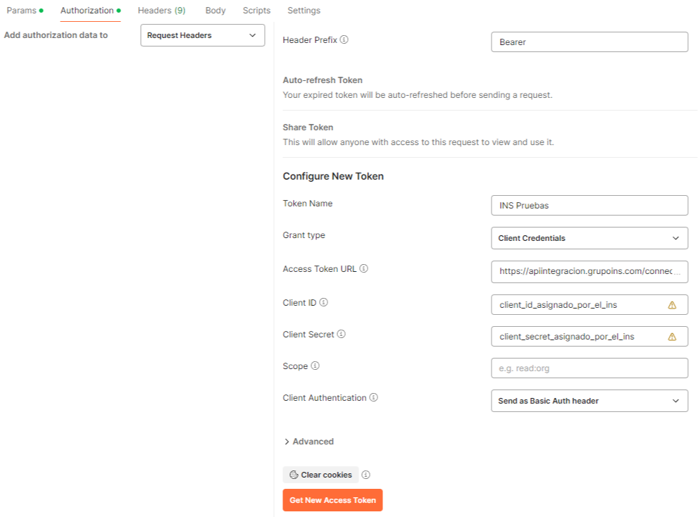 El token de acceso retornado por el servidor de autorización, debe enviarse en un encabezado HTTP para todos los llamados que se realicen a los APIs del INS. Este encabezado se denomina Authorization y tiene el siguiente formato: